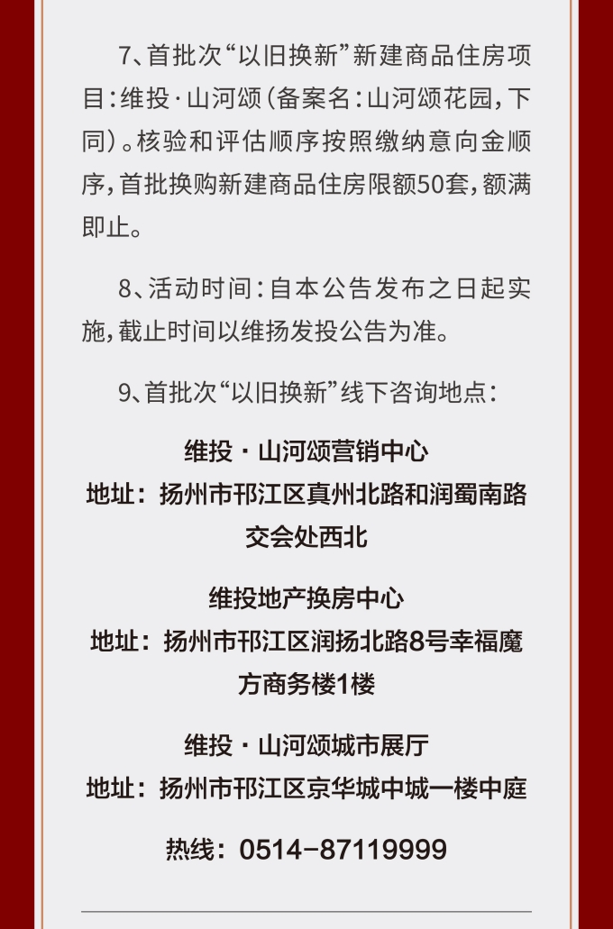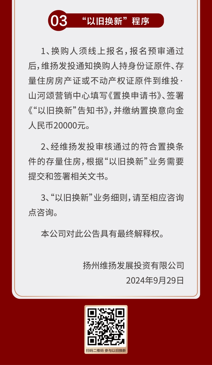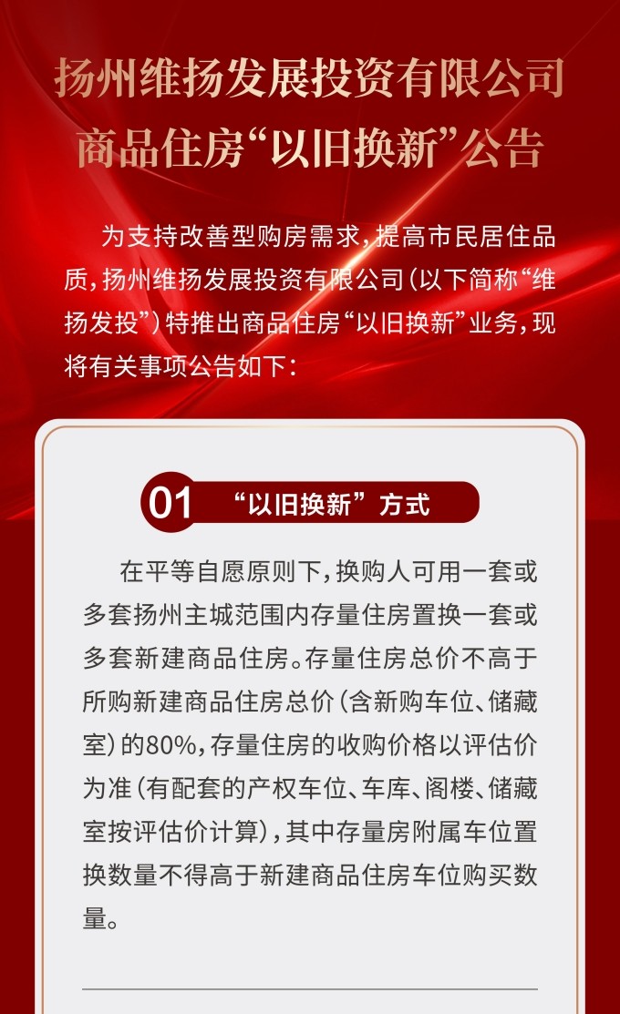 住房“以舊換新”“以房換房”是各地房地產(chǎn)新政中以“小細節(jié)”撬動“大市場”的重要舉措。維揚發(fā)投積極響應(yīng)政府新推行的“以舊換新”政策,踐行“惠民”理念,整合各項資源,搭建換房中心平臺,為買房人提供一站式以舊換新置換服務(wù),推動激活邗江區(qū)商品房市場活力。 此次維揚發(fā)投“以舊換新”工作以其自主開發(fā)的維投·山河頌項目為試點,由國企背書、置換范圍廣、全流程專業(yè)服務(wù)。首批換購新建商品住房限額50套,換購人可通過登錄“維揚發(fā)投商品住房‘以舊換新’線上報名系統(tǒng)”報名,具體要求詳見公告。